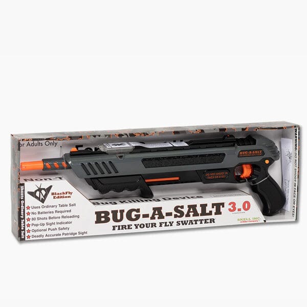 The BUG-A-SALT 3.0 is specifically tailored to the needs of the more serious fly hunter. Those who are fluent in weaponry & gun handling will appreciate custom improvements such as cross-bolt safety, trigger redesign, and Patridge sight (not to be confused with the bird, the sight is named after the famous rifleman Patridge).